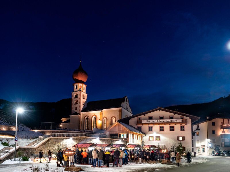 Ein stimmungsvoller kleiner Wintermarkt verwandelt den Dorfplatz von Tiers in ein Weihnachtsmärchen