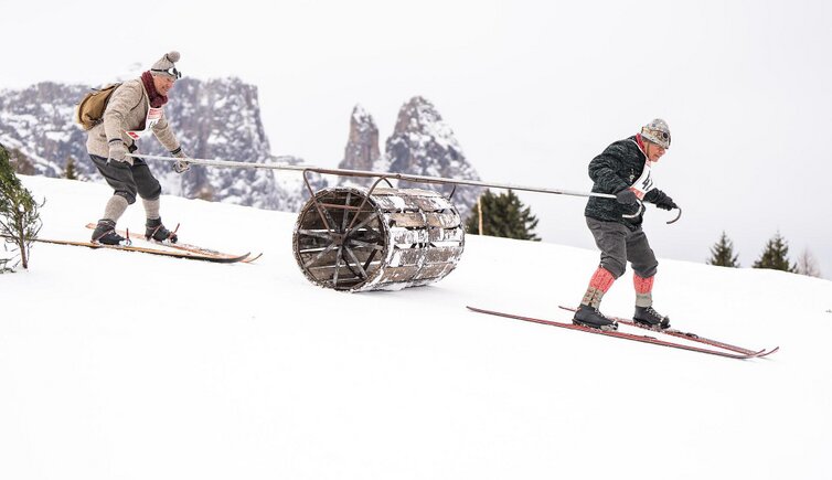 Skisport wie früher! Beim Nostalgie-Gaudi-Tag auf der Seiser Alm wird der Skisport vergangener Zeiten lebendig.