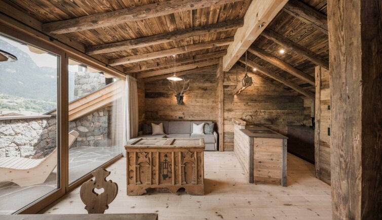 Eine antike Holztruhe hier, ein alter Bauernhaustisch da – die Mischung aus historischen Elementen und moderner Ausstattung schafft ein einzigartiges Ambiente.