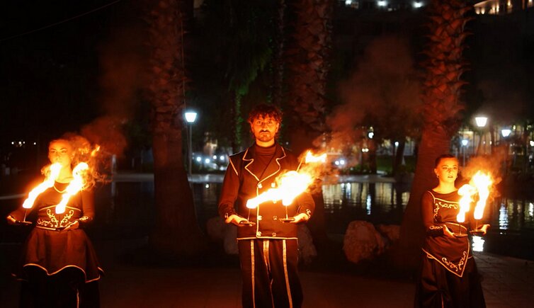 With ELEMENTRIS, darkness becomes a stage: three fire artists bring light, warmth, and energy to the darker season. Accompanied by powerful music, they create a 20 - 25-minute fire show featuring fire fans, flaming hula hoops, and many other captivating elements. A visual poem of flames, movement, and atmosphere that mesmerizes the audience.