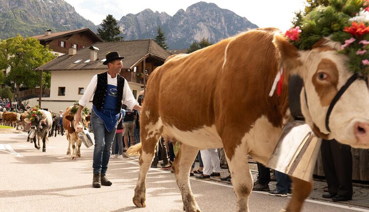 At 10.00 a.m. the cattle will be decorated at the Malga Tuff from where they will be driven to Fiè. They will arrive at Fiè at approximately 11.30 a.m. or 12.00 p.m. At 1.00 p.m. there will be benediction of the cattle followed by a festival at the festival place Völs.