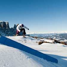 Lo Snowpark Alpe di Siusi è completo con 40 ostacoli: vari box, jump, wall, step, quarter e rail. La ciliegina sulla torta è la più lunga Medium Line d'Europa, assolutamente da provare. Il parco si sposa perfettamente con il panorama alpino circostante poiché nella sua Wood Line puoi divertirti con ostacoli di legno, mentre i jump ivi presenti regalano viste incantevoli sulle impressionanti vette circostanti.